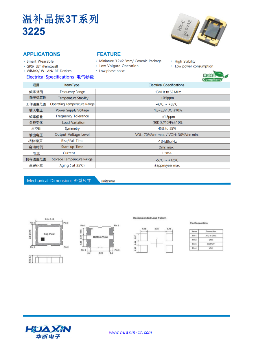 國產晶振華昕TCXO3225溫補晶振32MHz 規格參數